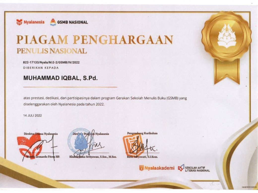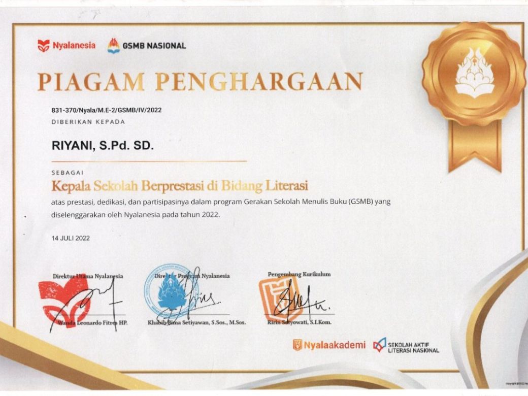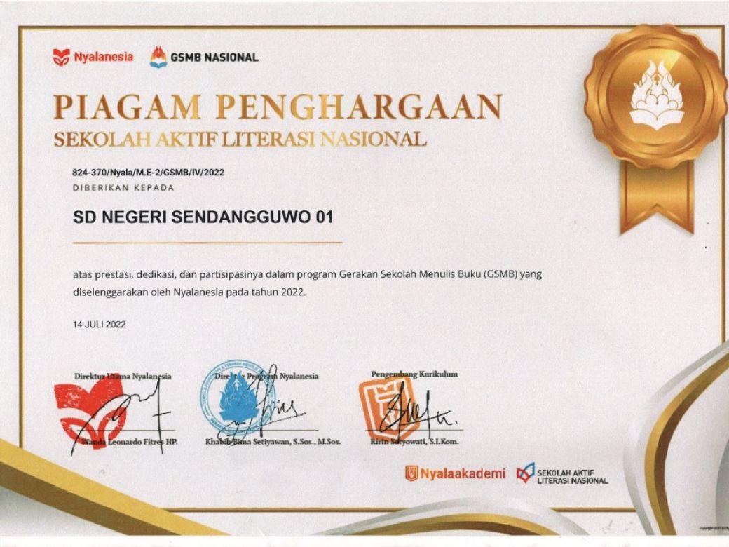 Dan Bu Riyani, S.Pd. SD selaku Kepala sekolah SD Negeri Sendangguwo 01 mendapat piagam penghargaan sebagai Kepala Sekolah Berprestasi di Bidang Literasi atas prestasi dedikasi dan partisipasinya dalam program Gerakan Sekolah Menulis Buku (GSMB) yang diselenggarakan oleh Nyalanesia pada tahun 2022.